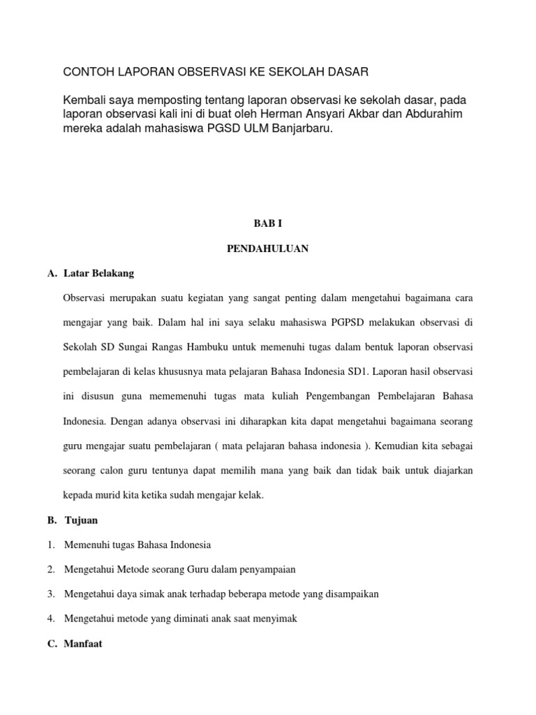 Contoh Laporan Observasi Ke Sekolah Dasar Docx